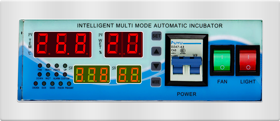 The new generation intelligent humiture incubator controller is a fully-intelligent microcomputer control system designed and developed for incubation industry and it applies the latest microelectronic technology and new type components. It applies the microcomputer chips to have strong anti-interference and high stable performance; the temperature sensor applies the high precision sensor to have high temperature collection precision and wide temperature range; it applies high performance humidity sensor to high precision to effectively ensure the stableness and reliability. It has the design of user-friendly four screens for display including two screens displaying the temperature and humidity of incubator and other two screens displaying the egg turning times and incubation days by pressing the keys and displaying the preset temperature and humidity by pressing the keys. And six kinds of incubation modes for user-definition, chicken, duck, goose, pigeon and blackcock are available for selection.
